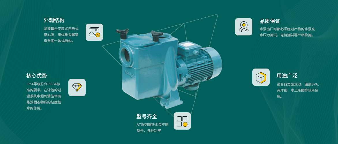 AT系列铸铁水泵不同型号,多种功率,适合各类型快猫记录生活记录你、温泉SPA、海洋馆、景观池、水上乐园等场所使用。